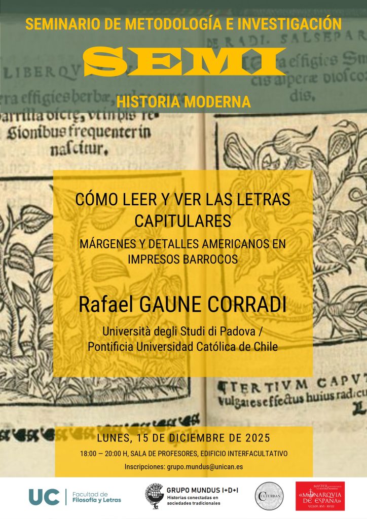 En esta cuarta sesión del XVI SEMI contaremos con la presencia de Rafael Gaune Corradi de la Università degli Studi di Padova y la Pontificia Universidad Católica de Chile con el trabajo titulado «Cómo leer y ver las letras capitulares márgenes y detalles americanos en impresos barrocos».